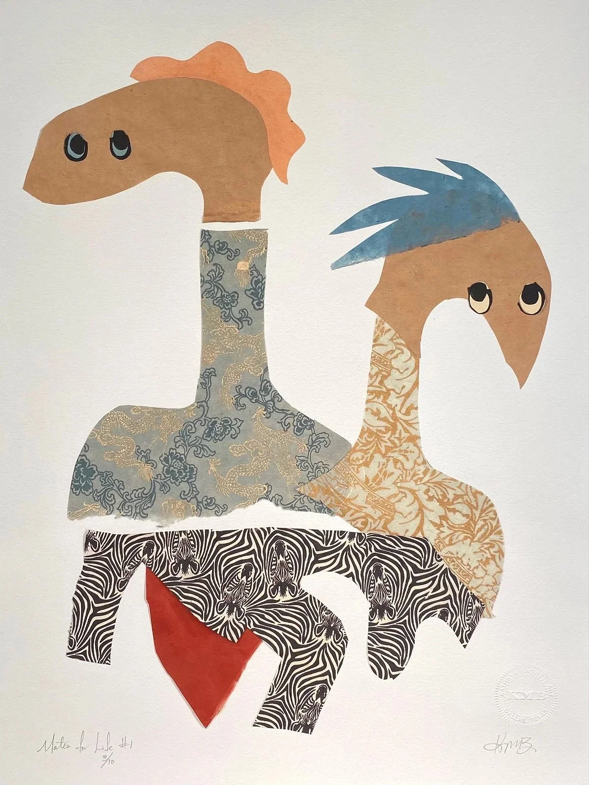 Lasting love is the theme of this series of paper collages. While not the rule for all species, when the phenomenon of ‘mates for life’ is observed in our natural world, a sense of respectful love surfaces. These works depict a reverence for such kindred spirits.