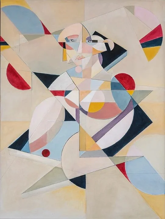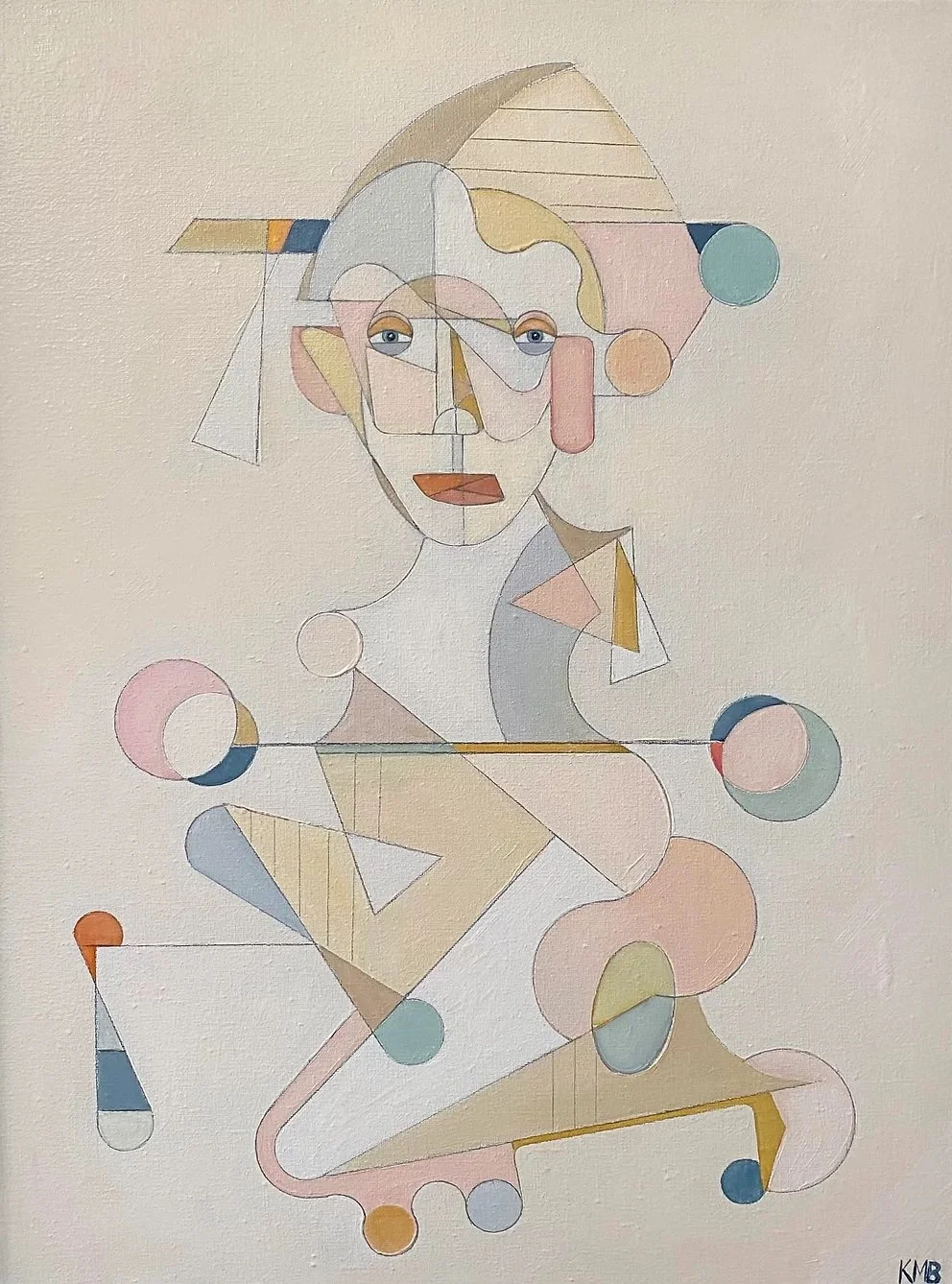 The series is a group of geometrically treated women with strong color punctuations. To the artist, the lines and shapes in the series express physical volume and mass in a quasi-cubist style, but also thought and emotion. The works are oil and graphite on canvas.