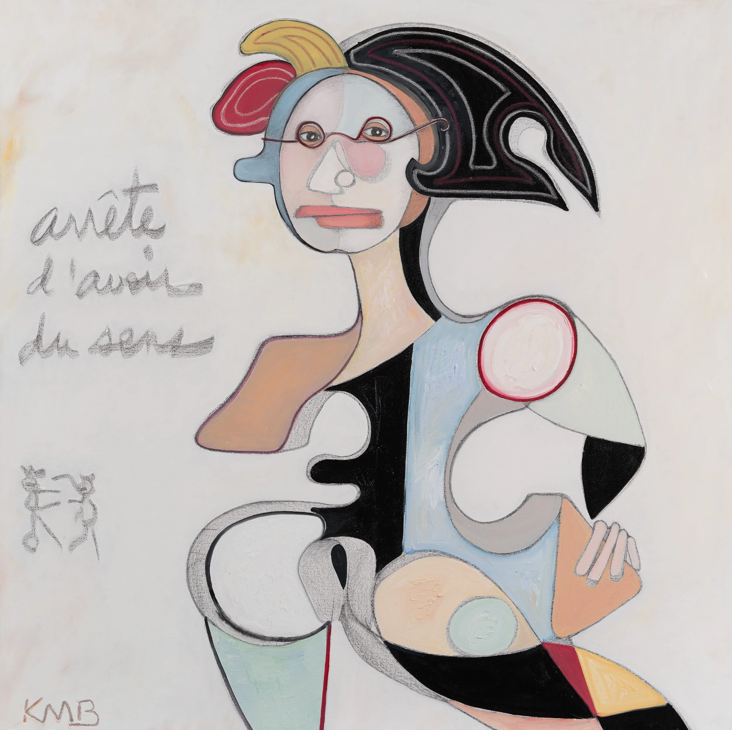 The artist includes the title in French, positioned above two miniature figures drawn in a primitive style. There is irony throughout each element of this piece.