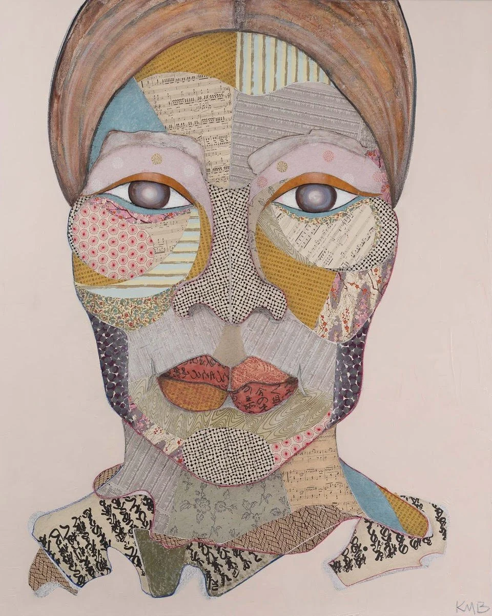 This portrait is composed of a variety of papers, including vintage music, colorful handmade artisan papers from around the globe and the financial pages of the Wall Street Journal.